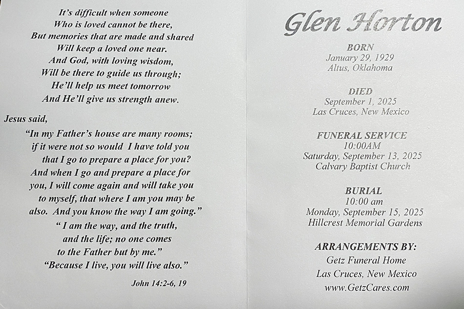In Loving Memory of Glen E. Horton Glen E. Horton, a devoted husband, father and grandfather, passed away peacefully on Sep 1st, 2025, leaving behind a legacy of kindness, humor, and dedication. Born on January 29, 1929, in Altus, Oklahoma, to Arthur T. Horton and Odessa Johnson, Glen lived a rich and purposeful life, touching the hearts of all who knew him. Glen pursued his passion for agriculture at Eastern New Mexico University before earning a degree in Agronomy from New Mexico State University (NMSU) in 1958. His career with the New Mexico Department of Agriculture began in Roswell, where he served as an inspector for the Division of Plant Industry from 1959 to 1964. In 1964, he was appointed Division Chief of Feed, Seed, and Fertilizer, a role in which he excelled. Glen’s leadership extended nationally as he proudly served as president of the National Plant/Food Control Officials from 1981 to 1982. Alongside his public service, Glen ran a successful pest control business for 40 years, continuing it after his retirement from NMSU in 1984. In 2001, he stepped back to embrace his love for fishing, hunting, and traveling, savoring life’s simple joys. Glen was a man of faith and a member of his local church community. At Westside Baptist Church, he served briefly as Sunday School Superintendent, where his humorous announcements were fondly remembered. He was also a charter member of Calvary Baptist Church, contributing to its early days by helping lay the sidewalks. Glen served in the United States Air Force from 1947 to 1953, including time stationed in Germany during the Korean War, fulfilling his duty with honor. Above all, Glen was a family man. He shared 44 beautiful years with his beloved wife, Cindy Horton. He is survived by his daughter, Donna Huey of Peoria, Arizona; sons Tom Horton of Rio Rancho, NM, and Charles Horton of Wilton Manor, Florida; stepdaughter Kerri Provencio and her husband Robert Sandoval of San Antonio, Texas; and stepson Caleb Provencio and his wife Michelle of Monument, Colorado. Glen’s warmth extended to his grandchildren: granddaughters Jessica Brunk (and her husband Mark), Delanie Horton, and Jamie Horton; grandsons Donnie Glen Horton, Jake Provencio, and Ben Provencio; and great-granddaughter Logan Moreno. He is also survived by his sister-in-law, Peggy June Horton. Glen was preceded in death by his parents, Arthur T. Horton and Odessa Johnson, his sisters Mary Nell and Rozella Lagmay, and his brothers Doyle Horton and Elvin Horton. Glen’s humor, generosity, and love for life will live on in the hearts of his family, friends, and community. His memory is a blessing, and his legacy endures through the countless lives he touched. The family wishes to thank the medical staff at Mountain View Hospital and La Posada Assisted Living and Hospice for the great care given to Glen and family during his final days. A visitation is scheduled for Friday, September 12, 2025, from 5:00 pm to 6:00 pm at Getz Funeral Home. A Funeral Service will be held at 10:00 am on Saturday, September 13, 2025, at Calvary Baptist Church 1800 S. Locust, Las Cruces NM. To order memorial trees or send flowers to the family in memory of Glen Horton, please visit our flower store. |